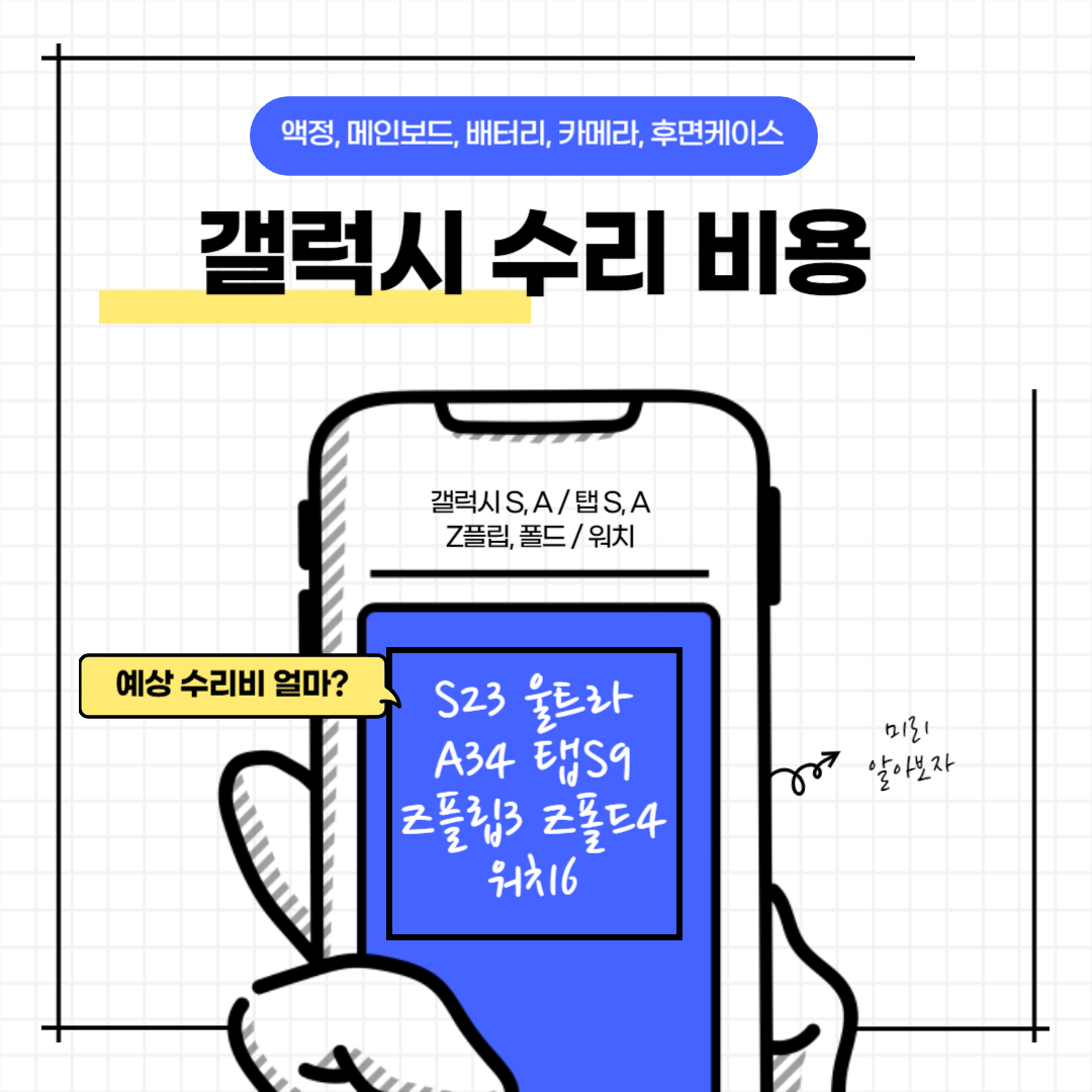 휴대폰이나 탭, 워치를 사용하다보면 액정이나 카메라를 교체해야하거나 심한 경우 메인보드를 교체해야할 수도 있습니다. 어느정도 가격인지 미리 알지 못하면 서비스센터에 갔을때 당황할 수 있습니다. 여기에 오신 분들은 운이 좋으시네요.