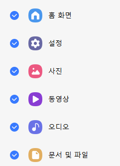 전화 및 연락처, 메시지, 앱, Galaxy Wearable, 홈 화면, 설정, 사진, 동영상, 오디오, 문서 및 파일 중 원하는 항목을 선택하여 백업을 진행시킵니다.